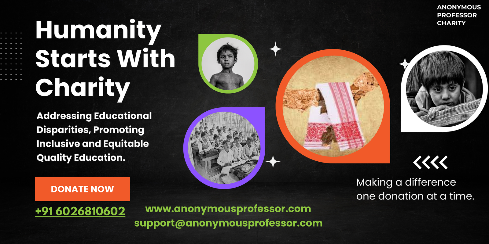 An organization dedicated to promoting education for underprivileged children in Assam. Anonymous Professor operates without any political or religious affiliations. It sustains its initiatives through independent fundraising activities and generous donations from individuals and groups. Contact: support@anonymousprofessor.com
